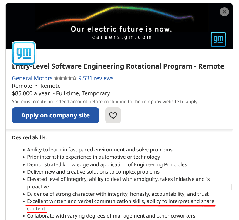 For example, many companies list advanced writing skills as a requirement in their job ads, like General Motors.