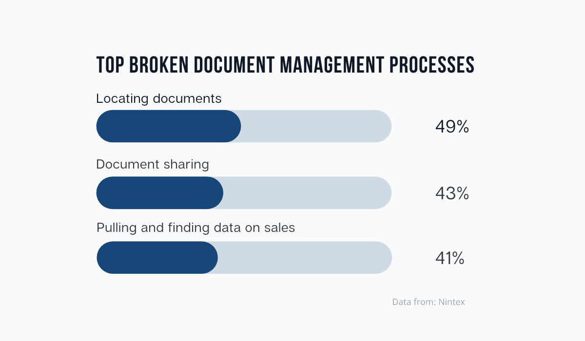The study shows that 49% of the employees have trouble locating the right document, while 43% report that they experienced issues with document sharing.