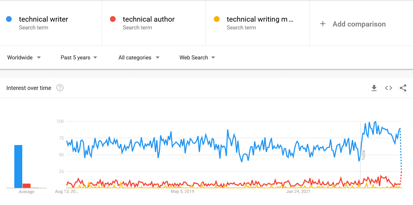If we use Google Trends to show us the popularity of search terms related to technical writing jobs, we can see that people mostly search for the simplest ones.