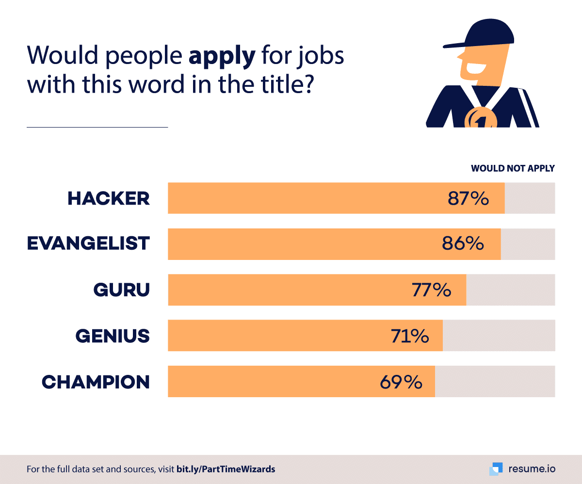 Therefore, if you’re thinking about adding words like “guru”, “master”, or “ninja” to the job title, keep in mind that you can deter potential candidates who either won’t find your job ad or they won’t apply to it precisely because of terms like those.
