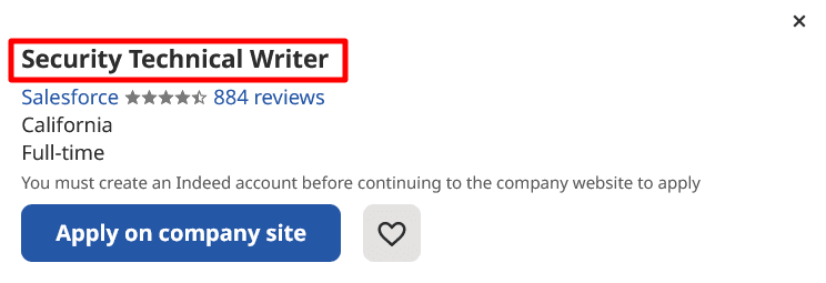After all, you want technical writers to find it with ease. That’s why this example from the Salesforce job ad is effective.