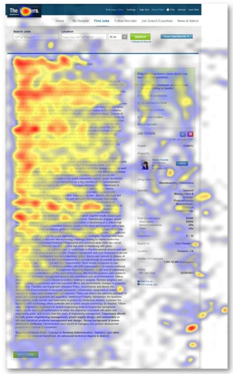 You can see that on the heatmap below—eye-tracking software revealed that the candidates read mostly the top of the job descriptions and don’t have the patience to get to the bottom.