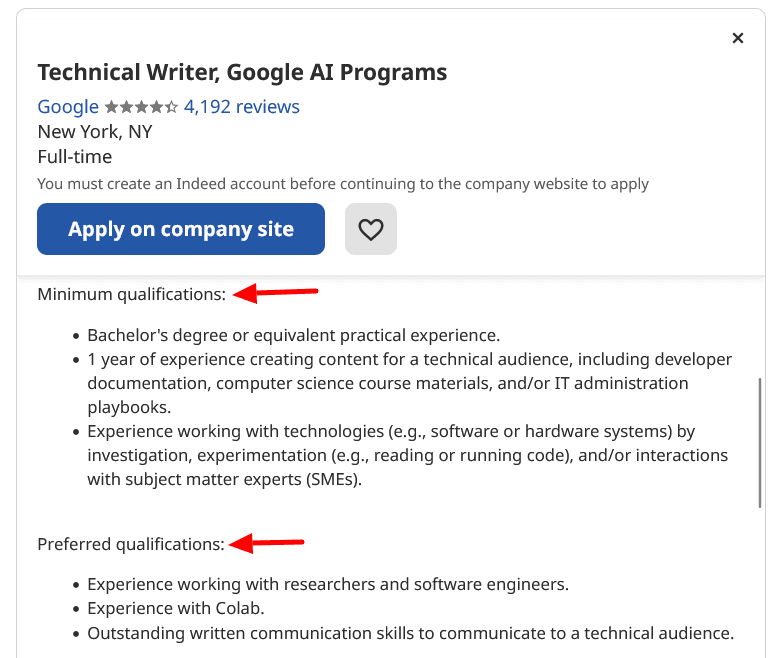 For example, a job description for a technical writer at Google AI Programs has a part with minimum qualifications and a part where they list their preferred qualifications.