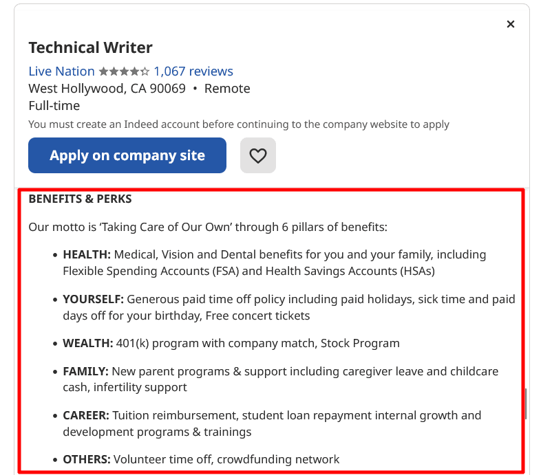 By presenting it like that, you can tie your transparency about benefits with your company’s values and culture and make a statement that would separate your job description from many similar ones.
